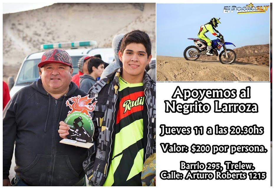 Este jueves 11 de agosto se realizará una cena en beneficio del piloto Luciano “Negrito” Larroza, quien hace muy poco tiempo rompió su moto en una competencia y ahora se encuentra ultimando detalles para tomar parte este fin de semana en la carrera del MX de Punta Verde, que se desarrollará en Viedma.